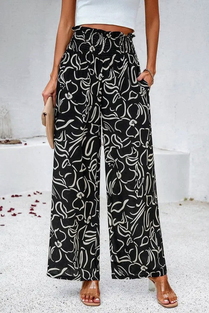Artfully detailed with a black and khaki floral print, these wide leg pants offer a bold but neutral statement. The smocked waistband provides a comfortable, flattering fit, perfect for all-day wear. Style with a simple top for a chic, bold look.