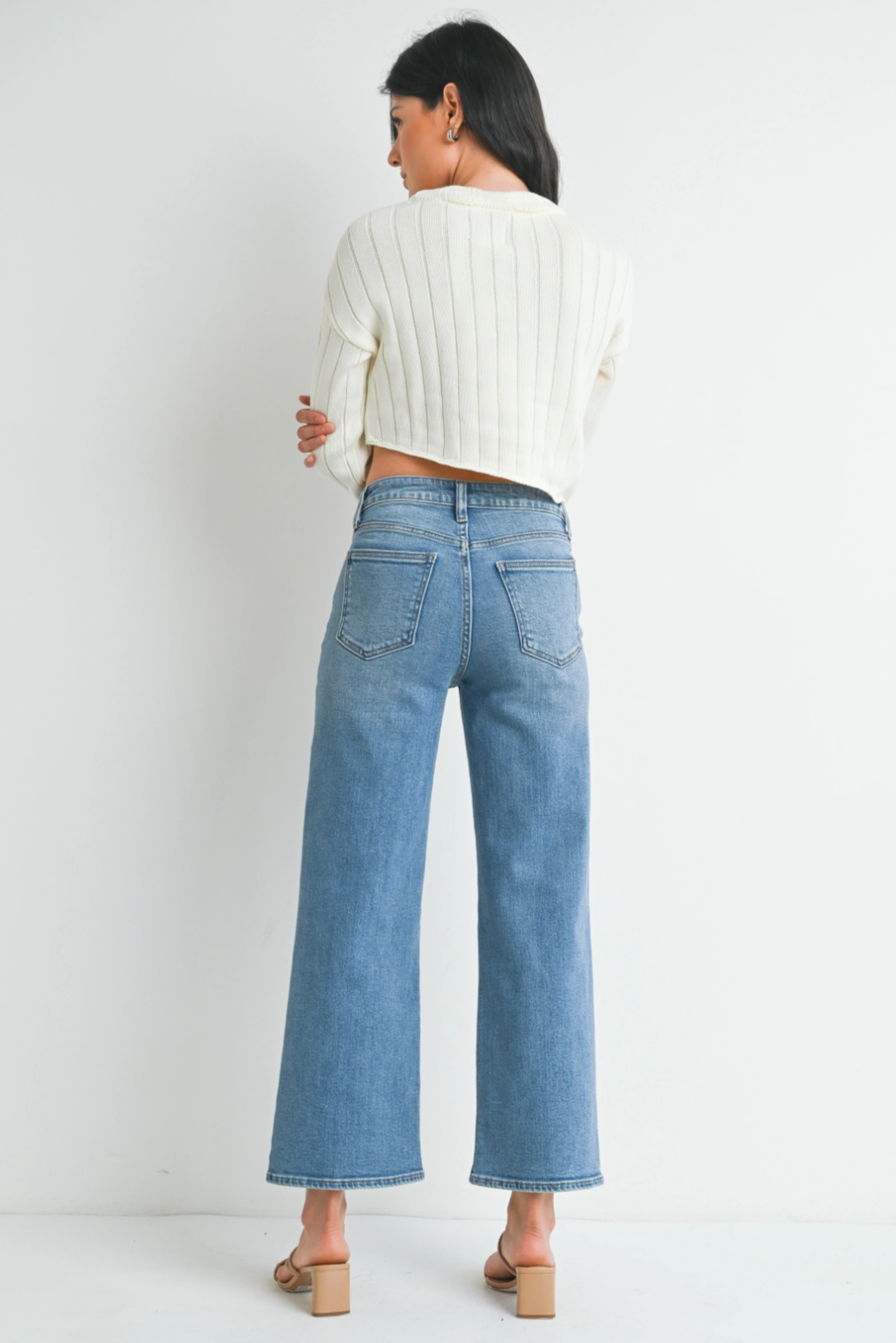 Looking for the perfect pair of wide leg jeans that are slightly cropped? These are a slimmer wide leg with no distressing, stretchy fit and finished hem. The slight ankle crop also makes these jeans perfect for petites! Made with a medium wash 93% cotton denim, the other 7% is that glorious element of stretch.